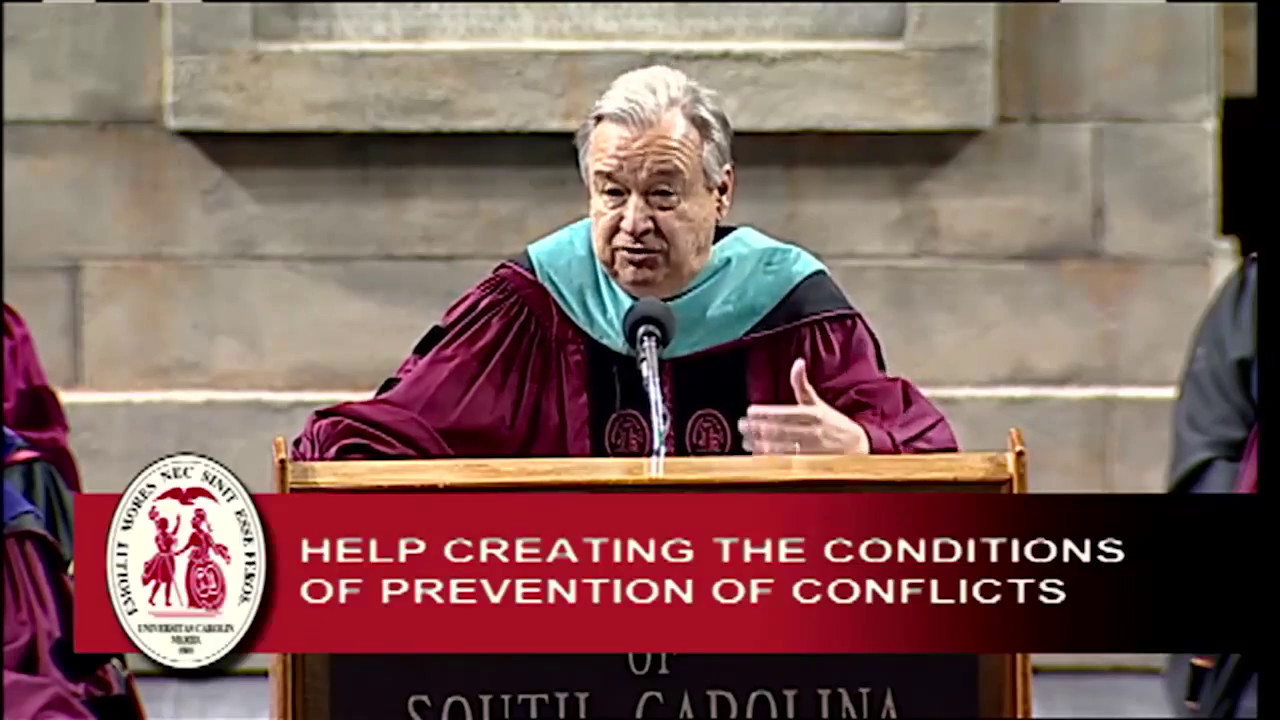 António Guterres , United Nations Secretary-General, delivers a commencement address and receives an honorary degree from the University of South Carolina.