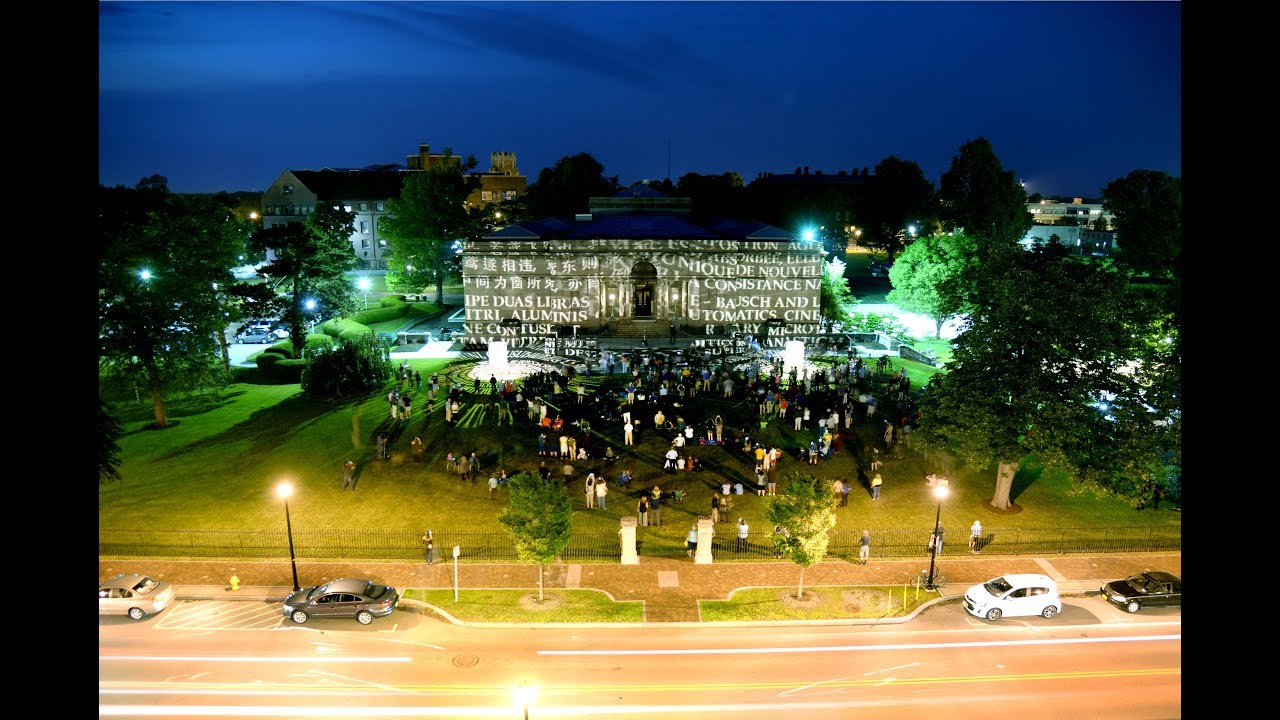 Argentum: Double-Positive is a new installation created by artist Jim Sanborn at the Memorial Art Gallery, which consists of two projection cylinders in front of the 1913 building. These bronze cylinders are perforated with a series of texts that light up at night (with the aid of an internal point source light) and be projected widely onto the facade and surrounding landscape at MAG. The texts specifically highlight the creativity and invention that have been the core industry of the city of Rochester for decades.