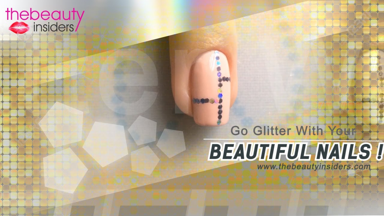 The easiest way to get nail art with glitter is to apply any nail polish and apply glitter top coat over.