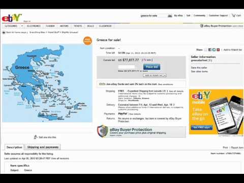 Greece for Sale on eBay! You can't make this up, free shipping! Too Funny. This is a FULL screen shot from eBay earlier today on April 5, 2012. There were at least 75 bids with the current bid at $77,877.77 USD. Be sure to check out the 'Questions and answers about this item' at the end of the listing.Full Screen Capture link: http://www.in5d.com/greece-for-sale-on-ebay.html