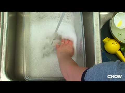 CHOW Kitchen Editorial Assistant Amy Wisniewski has a more environmentally friendly way to wash dishes: She soaps them up in a tub, and then rinses them all at once. That way, she uses less soap and water.