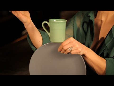 Watch more Easy Magic Tricks for the Dinner Table videos: http://www.howcast.com/videos/510542-Make-a-Sugar-Packet-Vanish-under-Napkin-Table-Magic-TricksLearn how to balance a glass on the edge of a plate in this dinner table magic tricks video from Howcast.A: Do you think that I could balance a cup on a plate?B: I don't know. Can you?A: Should I give it a shot? I'll give it a shot. You ready?B: Be careful.A: It's hard.B: You did it!A: Do you want to know how to do it?B: Yes.A: It's a really cool trick. People think you have mad balancing skills. You hold the plate and you can even show the plate like this. Then when you go to put the cup on top, you move your thumb to over here.B: To get a little extra balance.A: So from behind you're actually placing the cup right on top of your thumb and you're balancing the two together like that. The smaller the plate the better it looks. This is quite a large plate, because that way your thumb is right in the middle of the plate.B: Can I see?A: Yeah, sure. You want to make sure that your thumb doesn't peek out from on top.B: Okay.A: So that they don't know it's there.B: People will be fooled.A: Exactly.B: Ta-da!A: Ta-da! That's how you balance a cup on a plate.