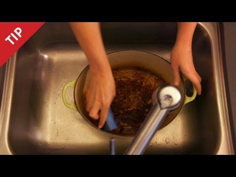 Anyone with a Le Creuset or similar enamel-coated pot knows what a challenge it can be to clean this type of cookware. CHOW.com's Katy Davies shares an unusual trick to help get even the most burnt dishes clean!