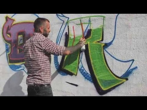 Watch more How to Draw Graffiti videos: http://www.howcast.com/videos/495533-How-to-Draw-an-S-GraffitiLearn how to draw the letter R in graffiti from graffiti artist Paes 164 in this Howcast video."My name is Paes164 and I'm a professional artist. I've been painting since a teenager, and I've been doing it for 20 years now. Find me at Paes164.com (p-a-e-s-164.com) My Facebook is facebook.com/paes_art. How to Draw Graffiti Letters of the Alphabet:RNext up, the letter R. We'd kind of get up here and just kind of whiff our little throw up around, basically just like that. Very simple, bubbly letters. Followed by a little bit of 3D . There's your bubble letter, throw up or also known as a throwy. Next we're going to do is a block buster. Get our base outerline of the R roughed out and fill it in. Remember to move quickly filling in. Especially if your using a fatcat and work your way through to avoid drips. Come back with some clean outline and whenever you're outlining you're actually coming right up against the overlapping the edge of the line from the previous back color with your outline and that's what kind of tightens and crispens everything up. Add on a 3D, a little bit of outer outlining or inner gelling for our blockbuster R. And keeping it still close to the same shape, we'll do a little wild style R. Wild styles are just something to defining your graffiti as something more complex. And of course, be more stylized so it's really up to you what your preference going to be on what little trinkets and curves you're going to add to your lettering. We'll also come through and add a little fill in. To pull in my can away from the wall as I go is all you need to do to create that fade. Now we'll add some outline. Outline always brings the letter out, adding a little bit of 3D again to give it that blocky look and make that letter stand out. You can even go and add extra colors to the 3D to make that pop out individually. Got the outline and everything done, so we go to the inner gel, also an inner outline with even brighter color. Alright. And our last step, an outer outline, use this bright green is kind a get around the whole letter. Boom. Radical wild style R."