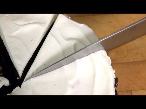 You spend all this time making a beautiful cake to serve your guests for dessert and then you go to cut it and the frosting sticks to the knife and then the crumbs stick to the frosting and the next thing you know you have a mangled piece of cake. Here's a quick tip to get a beautiful slice of cake every time. The best knife for the job is going to be a cake knife, but any knife with a long blade and a non-serrated edge will work just as well. Make your first cut, rinse the blade under hot water, give it a quick wipe with a towel and work your way around the cake, rinsing and wiping off the blade in between each slice. It may sound tedious but a beautiful slice of cake just tastes better.
