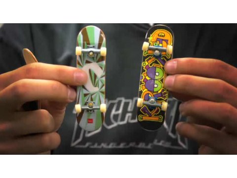 Watch more How to Fingerboard videos: http://www.howcast.com/videos/466099-How-to-Do-a-Shuvit-FingerboardingLearn about picking a tech deck from professional fingerboard competitor Taylor Rosenbauer in this Howcast video.Hi. My name is Taylor Rosenbauer. I've been traveling all over the United States to fingerboard competitions, demos, and I've appeared on MTV and just having a great time with this really fun hobby. I'm taking a trip to Germany, competing at the world championships for fingerboarding. Today I will be demonstrating finger-boarding. One very important thing when you first begin finger boarding, is finding a Tech-Deck, or any fingerboard, thats right for you. The best place to start with that is with Tech-Decks, because they're relatively inexpensive and they have basically the main types of fingerboards that you would get anywhere, just to get a feel for the different kinds. This is a wooden fingerboard, as you can see, with soft grip tape on the top, its foam grip tape offered by Tech-Deck. And then this one, on the other hand, is plastic, as you can see, with rough grip tape. And this wood one has a lot more shape, theres a more concave and the kicks go up a lot more than the plastic one. Really, you can combine the two, um, you can have a wooden fingerboard with rough grip tape or vise versa. And really just try out different types and find out whats best for you, because in the end it really all comes down to personal preference. Tech-Deck usually makes skinnier boards around 28 to 30 mm, while other companies can even go up to 32-33 mm. As for the price of fingerboard, Tech-Decks can go from, anywhere from $4 up to, I believe, $12, while other fingerboards, especially ones made out in Germany can go up to $150 for even a complete.