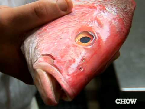 The way to examine a whole fish is you want to look at the eyes, make sure they're really clear. After a few days sitting around they can really get muddy. The flesh should be nice and bouncy. The fish should be nice and wet but not oily and mainly, it's going to be the smell. Really get in there. The closer you can get to it and smell it, the better. If it really smells like fresh and clean, it's going to be great.